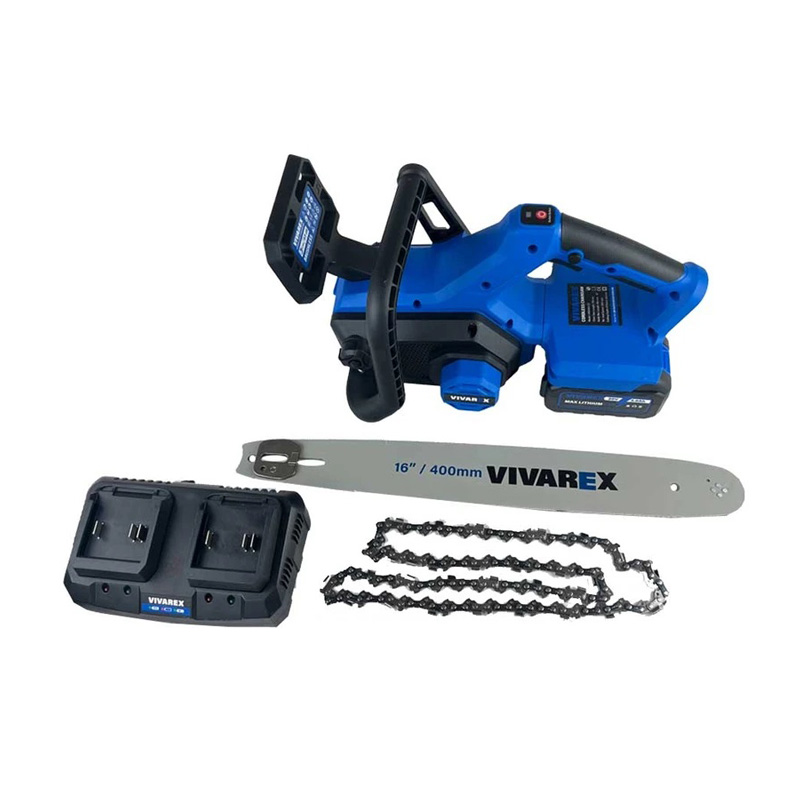 اره زنجیری شارژی 20 ولت 40 سانتی متر ویوارکس مدل VR2416V-CS همراه با دو عدد باطری لیتیومی با قابلیت شارژ سریع به بازار ابزارالات ارائه می شود. این دو باتری همزمان در اره قرار میگیرند. اره زنجیری شارژی 20 ولت 40 سانتی متر ویوارکس دارای موتور براشلس قدرتمند می باشد . این اره زنجیری شارژی 20 ولت ویوارکس برای راحتی کاربر دارای دسته ارگونومیک می باشد .اره زنجیری شارژی ویوارکس مدل VR2016V-CS برای توقف سریع دارای دستگیره ترمز ایمنی می باشد . این اره زنجیری شارژی 20 ولت 40 سانتی متر 2 عدد زنجیر با کیفیت دارد . برای انجام کار مداوم نیز این اره زنجیری شارژی ویوارکس دارای دکمه قفل کن است .